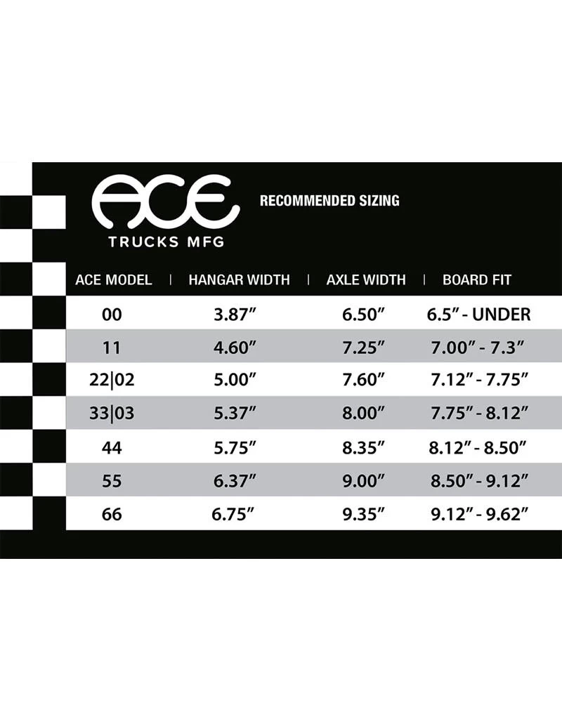 Ace trucks zijn voorzien van rockered hangers, die dikker zijn in het midden om kracht te bieden tegen grind-shock en offset yo grinds om je locked in te houden. Het lage profiel ontwerp in combinatie met een lagere kingpin vermindert hang-ups. Deze trucks hebben een slank profiel en zullen alles op hun pad verpletteren.