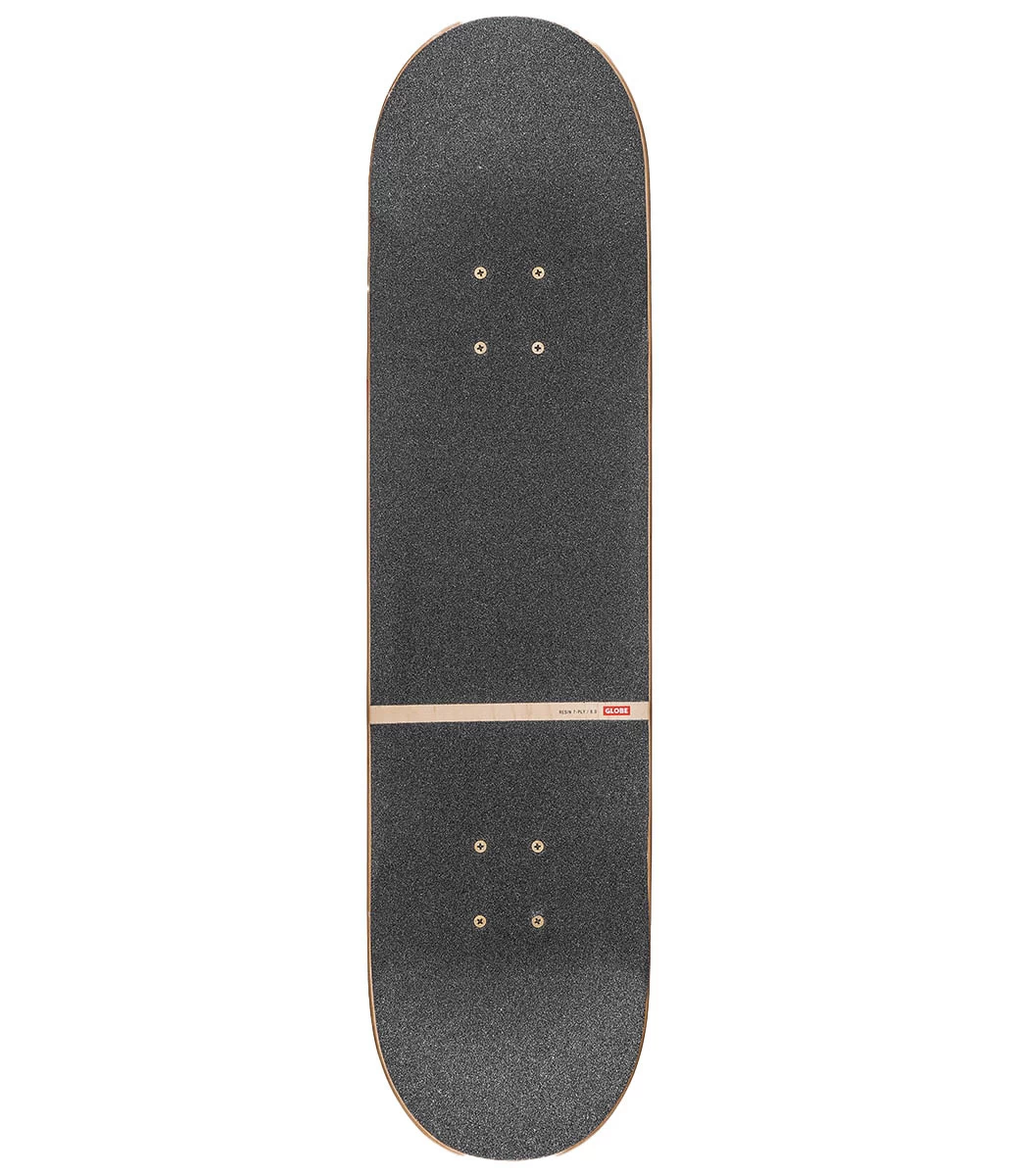 Dit Globe skateboard heeft 5,25″ Tensor Magnesium trucks en 53mm Conical 101a wielen. Het bovendek is een geupgrade griptape