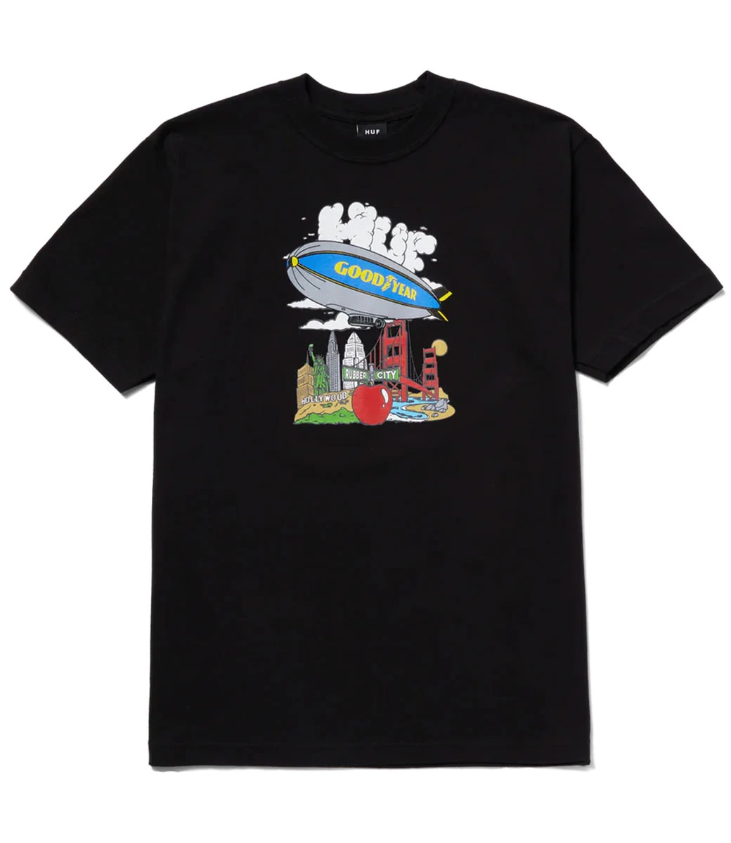 – HUF x Goodyear geweven label aan de binnenkant van de hals