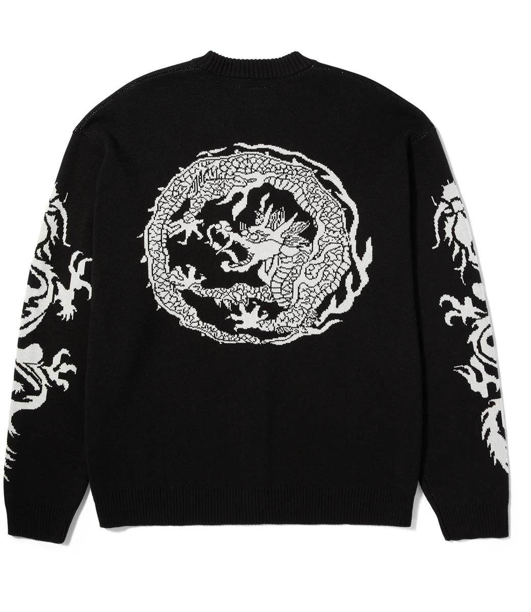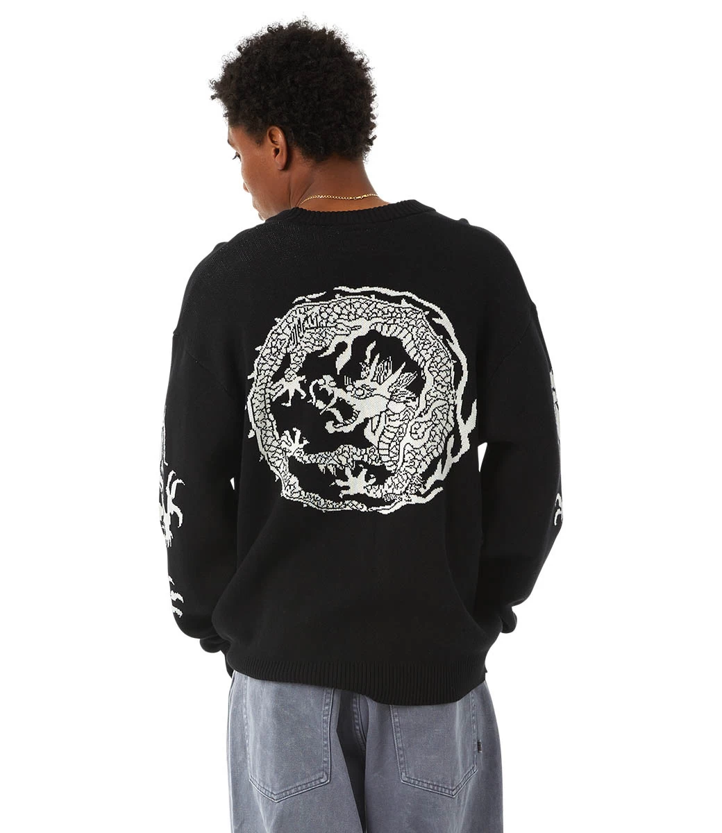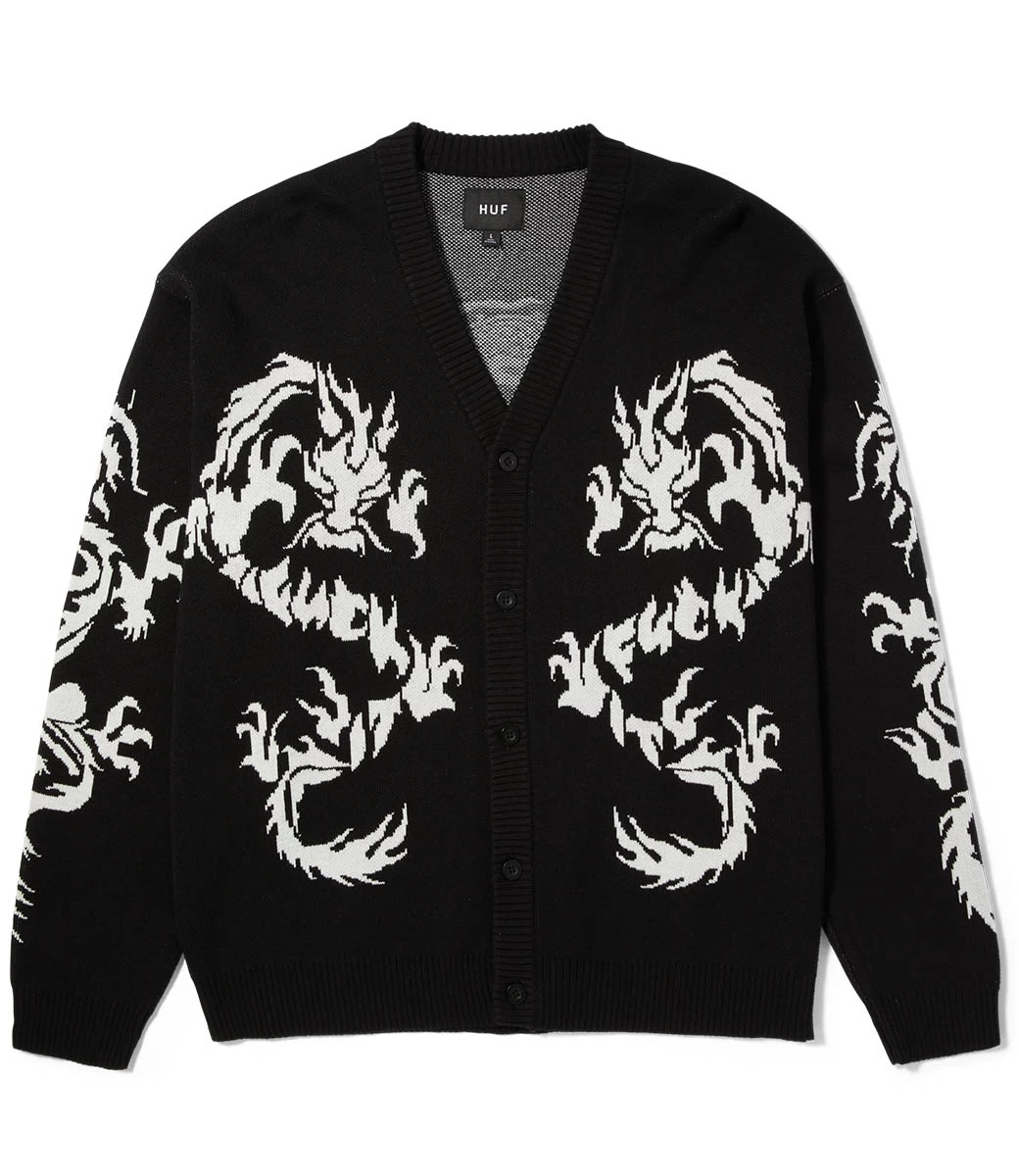 Een basislaag krijgt een op de dierenriem geïnspireerde behandeling voor de herfst. De Twin Dragon Cardigan is een verborgen stijl en heeft een jacquardgebreide constructie en artwork met een button-down voorkant en elegante gegraveerde knopen.