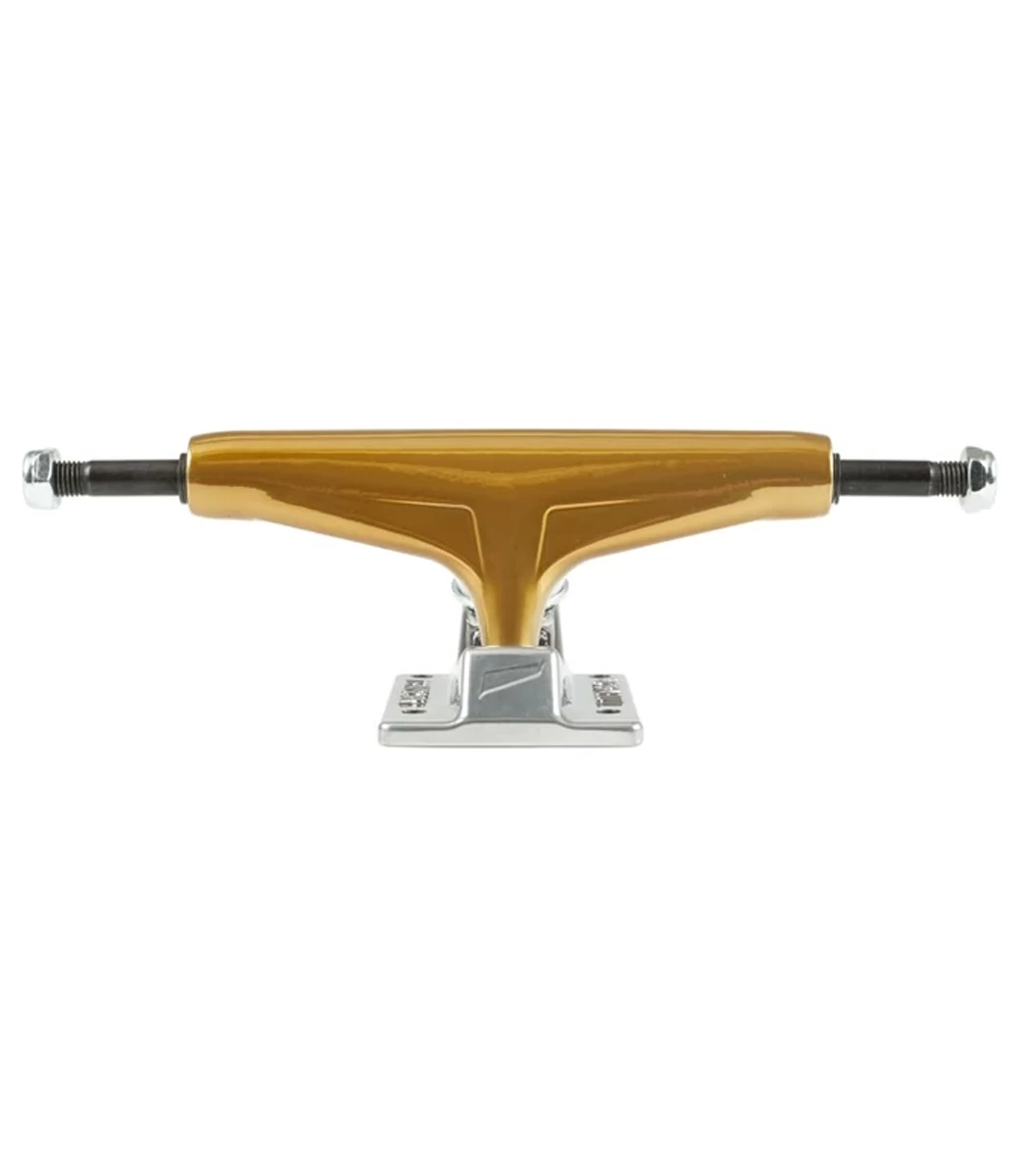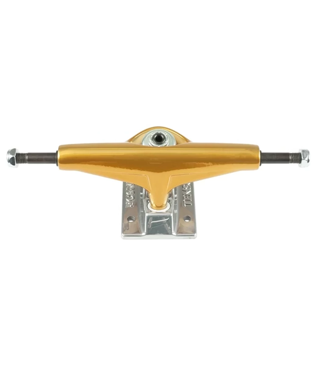 Begin met het opladen door die grinds met de TENSOR Mag Light Glossy – Gold/Silver. Gegarandeerd voor het leven, Tensor staat achter hun product om de beste kwaliteit truck op de markt te produceren. Een nieuw ontworpen truck gemaakt voor uw wens. Vervaardigd met een lagere kingpin om meer ruimte door die slijpen en roll-ins toe te staan. Ontworpen met een interlocking bushing techniek om gelijkmatig de reactietijd te verdelen door de bushing met versterkt staal in de belangrijkste gebieden wat resulteert in een algehele sterkere truck met 30% minder gewicht in vergelijking met alle andere truck bedrijven het creëren van de lichtste en sterkste truck op de markt.