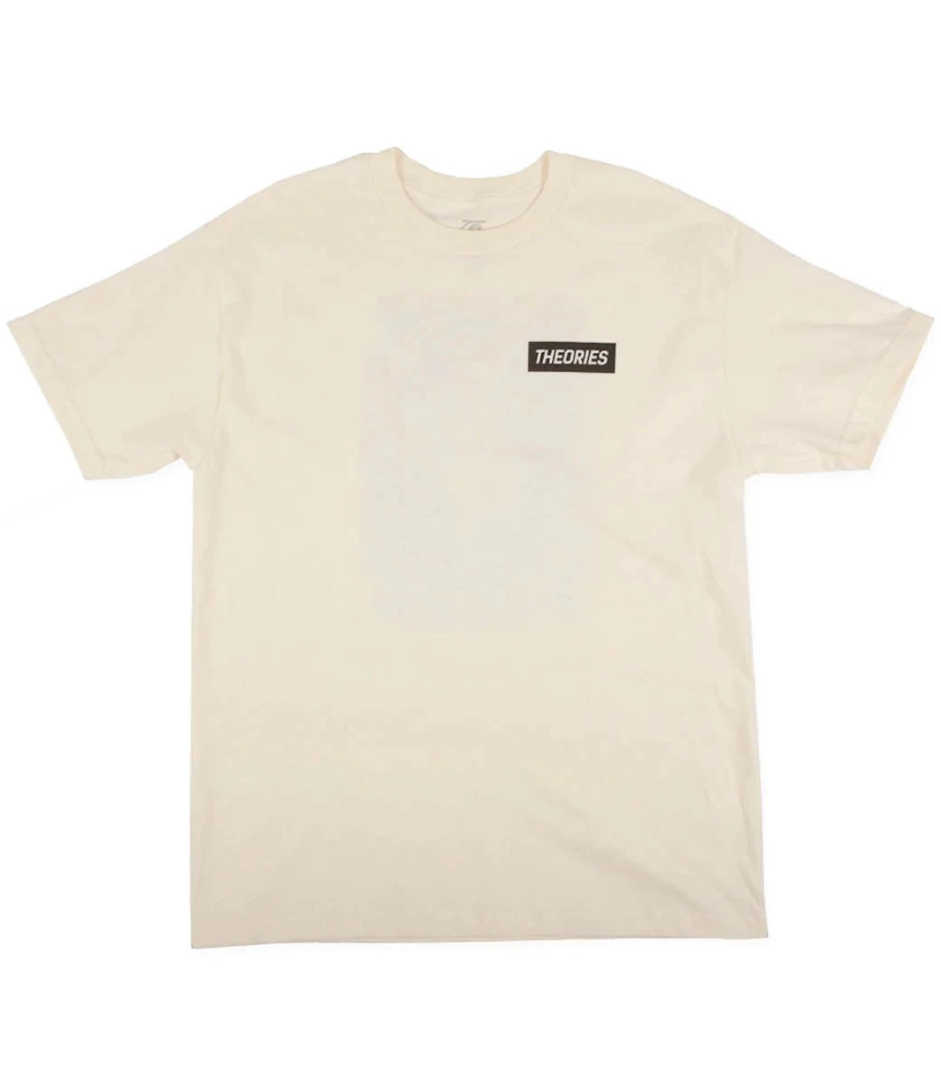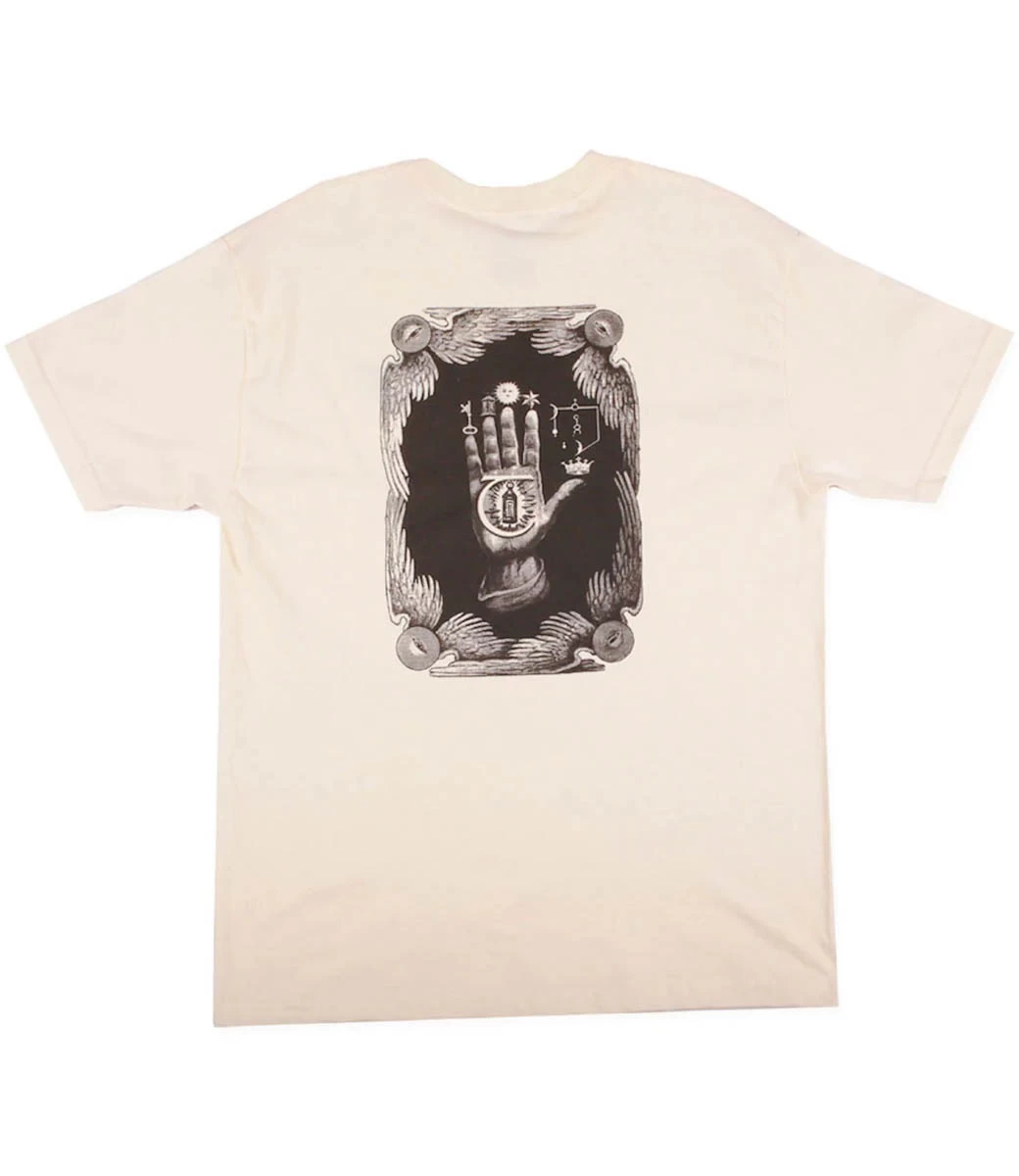 OG Hand of Theories-afbeelding gezeefdrukt op achterkant, met Stamp-logo op voorkant van borst op een crèmekleurig T-shirt.