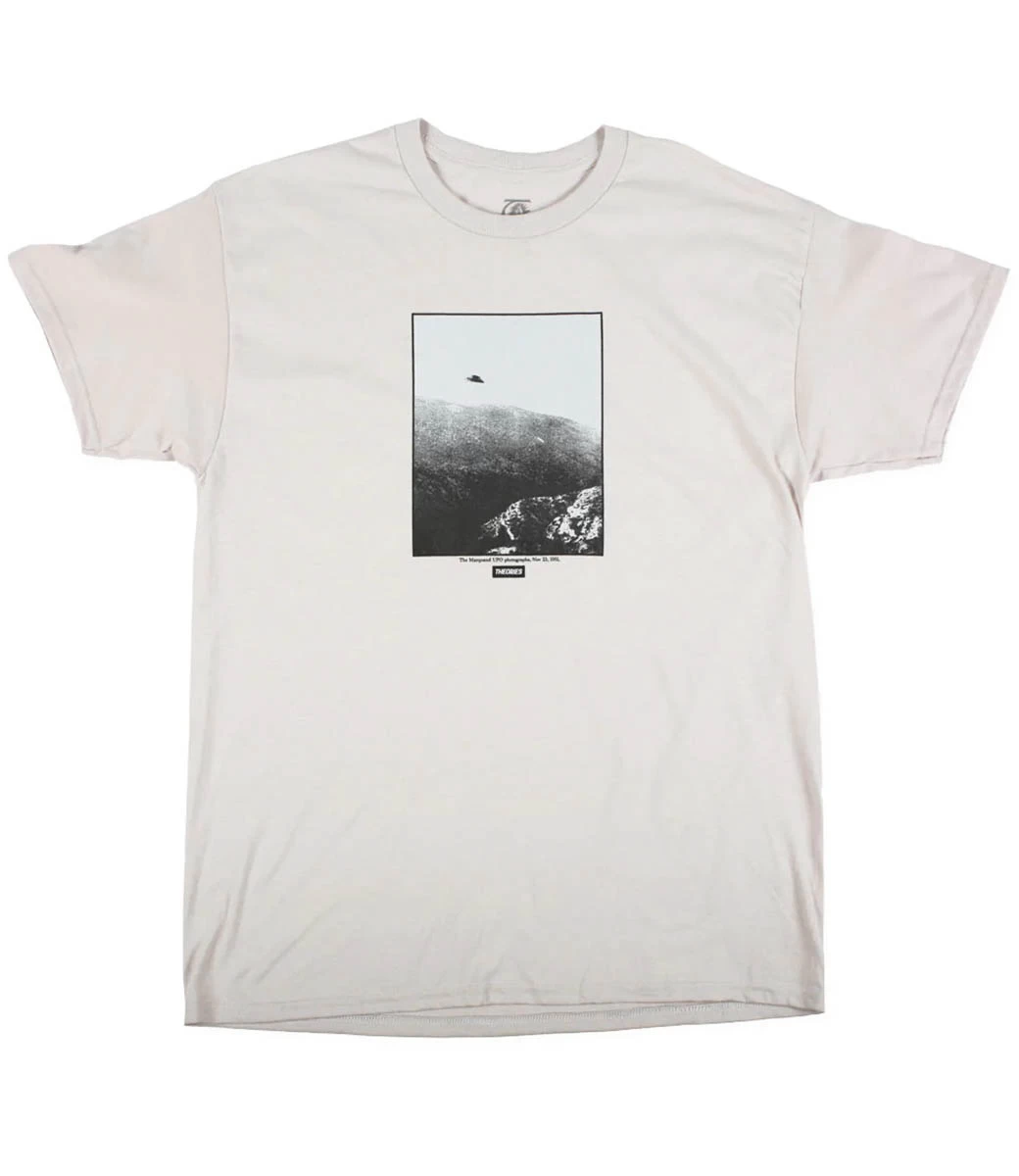 Guy B. Marquand, Jr., die deze foto nam op 23 november 1951 in Riverside, CA, zei dat het object boven de skyline een “vliegende schotel” was. Marquand beweerde dat hij en twee vrienden het object zagen voorbijvliegen met een zeer hoge snelheid en toen het terugkwam, had hij zijn camera klaar om een foto te maken. Gezeefdrukte foto aan de voorkant op zilverkleurig T-shirt.