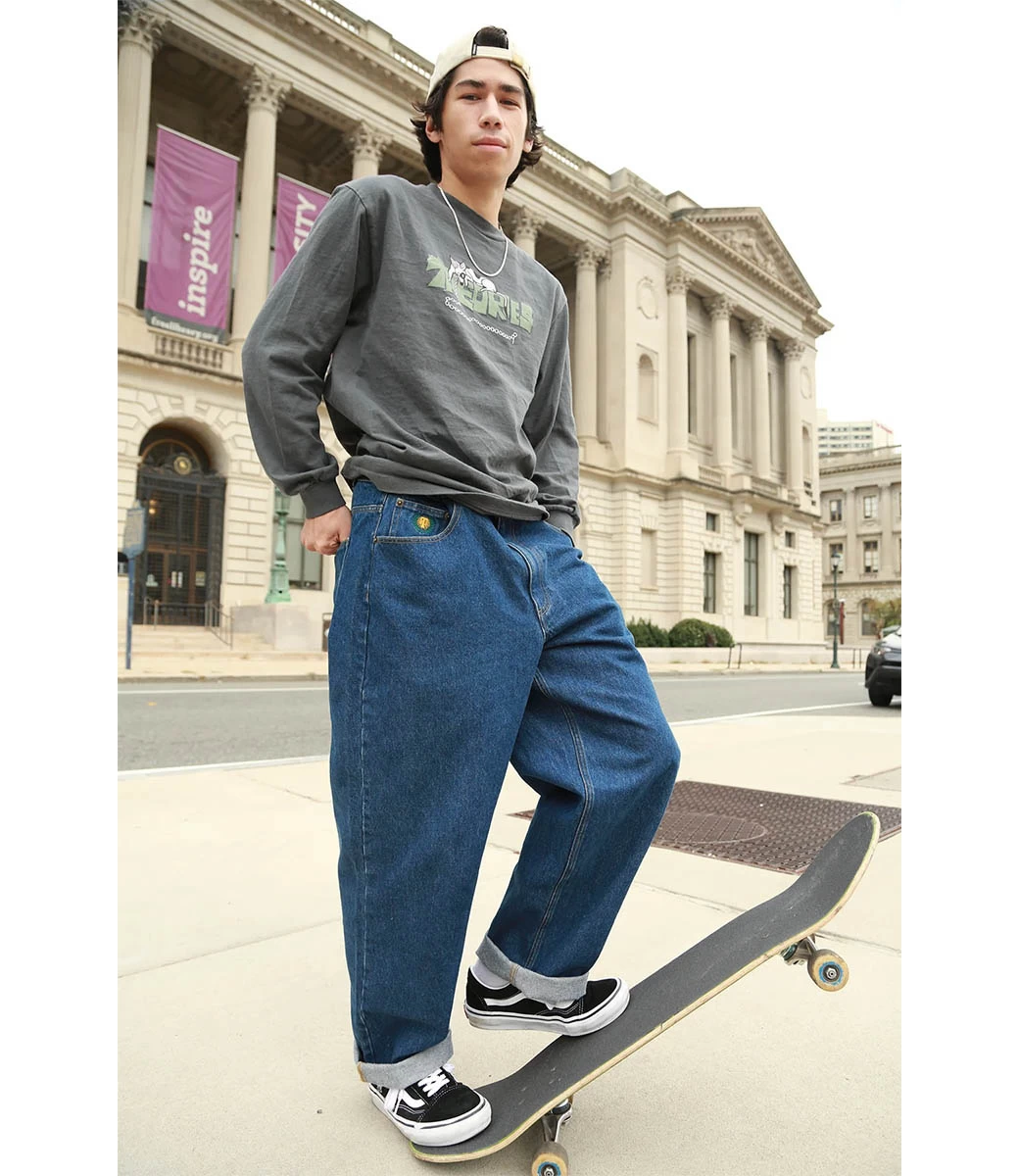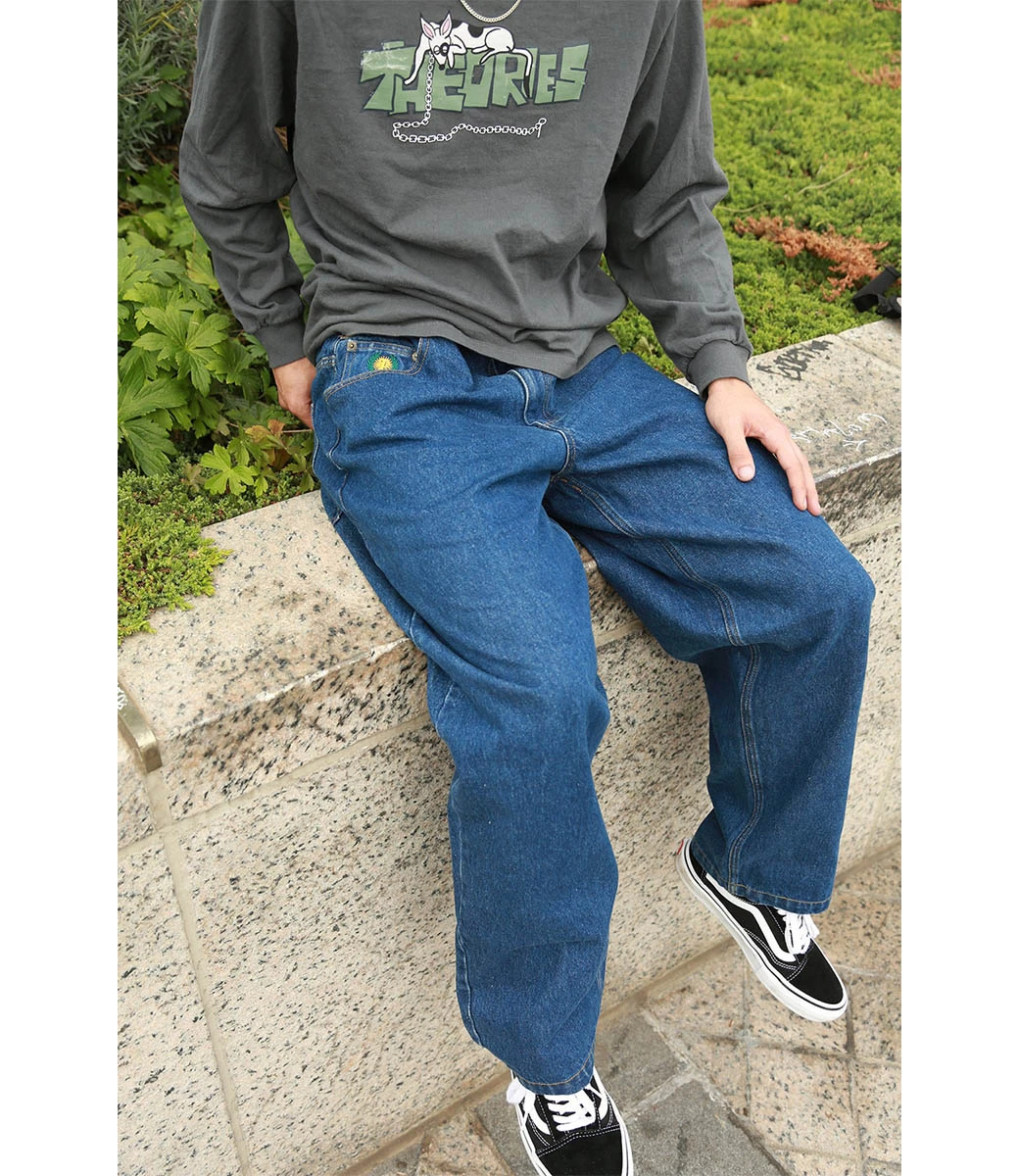 De Plaza Jeans is gemaakt van katoenen denim en heeft een baggy pasvorm met taps toelopende pijpen. Metalen rits- en knoopsluiting, geborduurd muntzakje met het “T”-logo op de voorkant en een rechterachterzak met het geweven “Theories”-label bovenaan de zak.